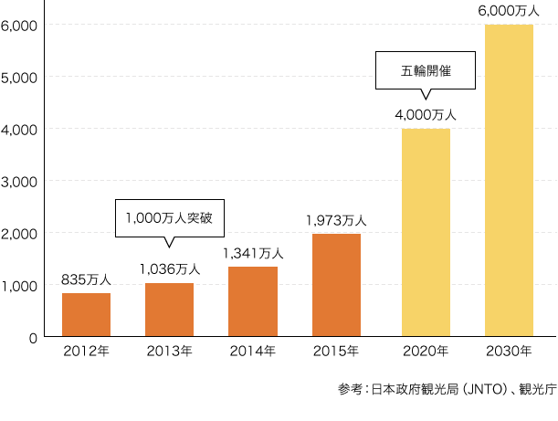 同年には、2020年の東京オリンピック・パラリンピック開催が決定し、円安も追い風となって、2015年(平成27年)には訪日外国人客数1973万7000人を記録しました。2000万人まであと一歩に迫ると同時に、大阪万博が開催された1970年以来45年ぶりに、入国者数が出国者数を上回りました。