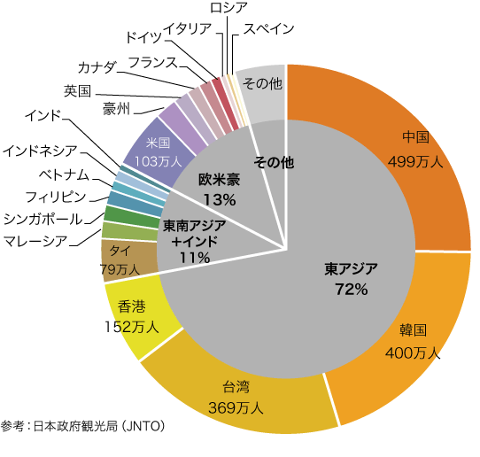 このように順調な伸びを示していましたが、2019年(令和1年)には、ラグビー・ワールドカップの開催で欧米豪からの訪日客は増加したものの、日韓関係の悪化の影響で韓国からの訪日客が大幅に激減したため、前年からの伸びは2.2%増にとどまりました。