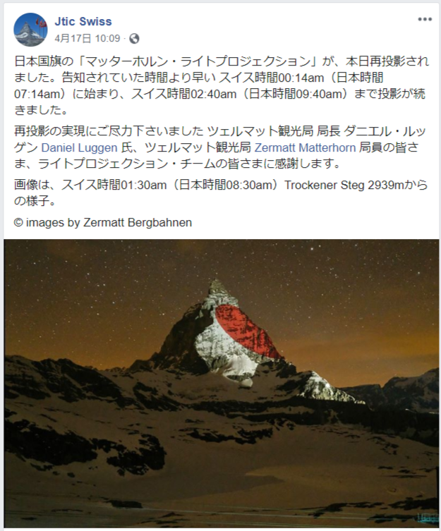 ▲JTIC SWISS Facebookより。4月17日には、マッターホルンに日本の国旗が投影された。(© images by Zermatt Bergbahnen)