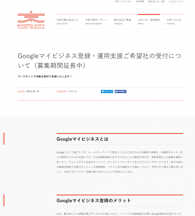▲京都市観光協会では、事業者向けHPでGoogleマイビジネス登録希望者を募集している