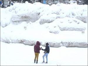 ▲高山市役所駐車場で雪景の写真を撮るタイからの旅行者