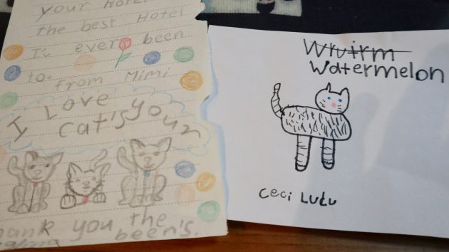 国別ではオーストラリア人が約7割で、シンガポール人、イギリス人と続く。驚くことに外国人客の約4割がリピーター。「1年に1度いらして、次の年の予約をして帰られる方もおられるんです」。では、5匹の猫はインバウンドに貢献しているのか? 「温泉とスキーが目的のお客さまがほとんどで、猫を目当てに来る方は今のところいらっしゃいません。ですが、宿に猫がいることで喜んでくださる方は多いです」とのこと。特に家族連れが増える12月下旬〜1月末には、広々としたフロントで子どもたちが楽しそうに猫と遊ぶ光景がたびたび見られると言う。滞在中に猫の絵を書いてプレゼントしてくれる子どももいて、片桐さんの宝ものになっている。