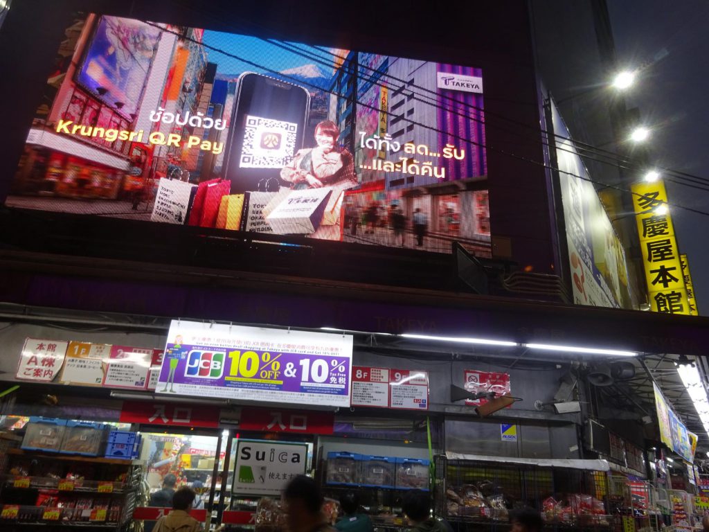 ▲多慶屋の電飾看板ではタイのQRコード決済が利用可能なことをPRしている