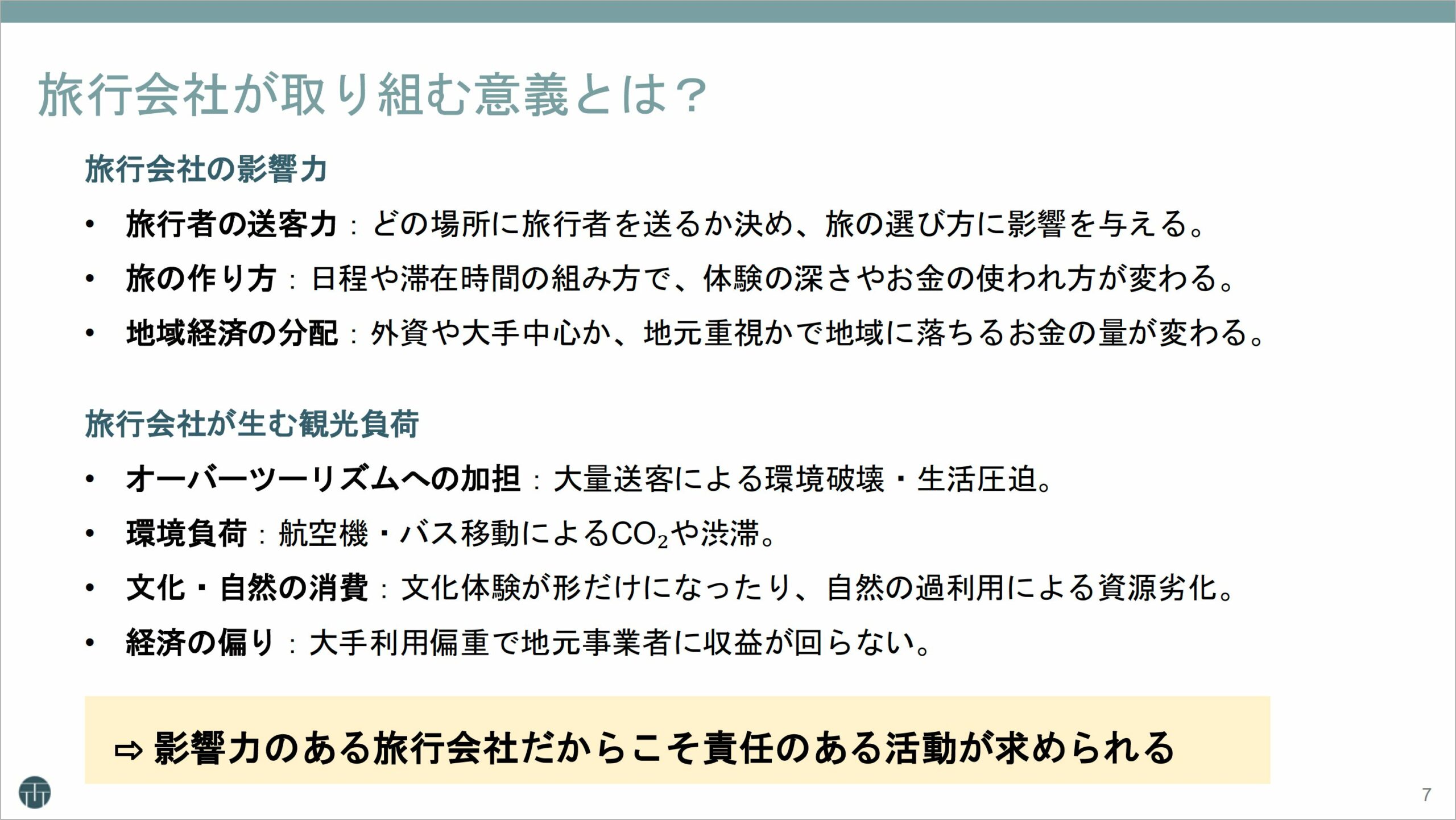 続いて、航空会社1社と旅行会社2社による具体的な取り組み事例が紹介された。訪問先、滞在時間、体験内容、移動手段、宿泊施設などを決定する立場にある旅行会社は、観光産業において大きな影響力を持つ存在である。それゆえ、オーバーツーリズム、環境破壊、文化資源の損失、地元経済への還元不足といった観光による負荷に対し、責任ある行動が求められる。