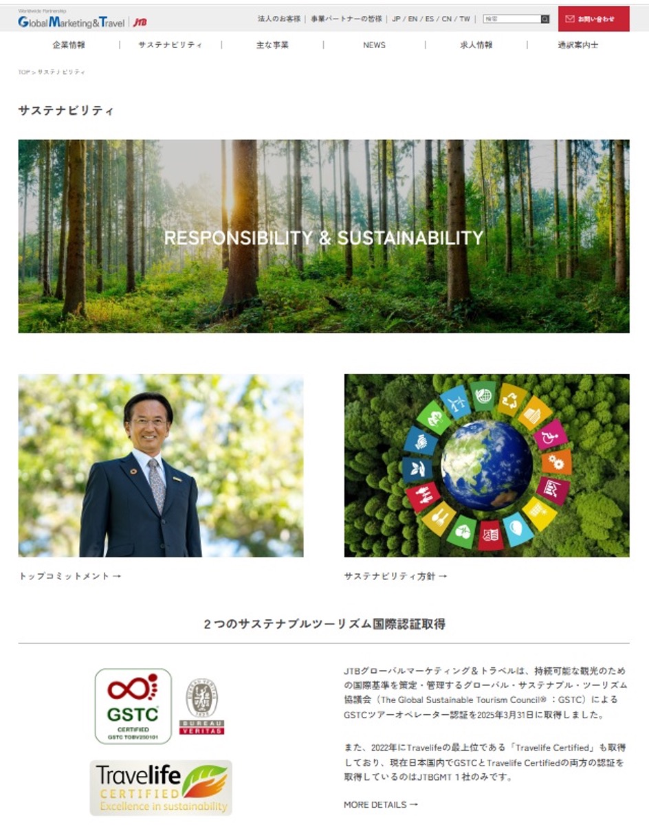 ▲JTBグローバルマーケティング&トラベルのサスティナビリティページ
