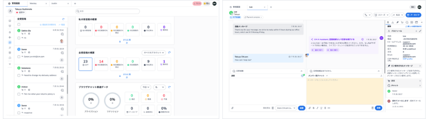 CM.comでは、APIを使用しないクラウド上のサービス(MSC)も展開している。このサービスを使えば、PCやスマートフォンの管理画面にログインするだけで、企業アカウントからWhatsAppメッセージの送受信ができる。追加の開発作業を必要とせず、管理者がチーム全体の顧客対応の状況をスムーズに把握・管理できる点が、大きな特長だ。