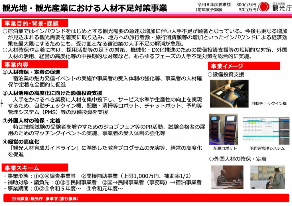 持続可能な観光地づくりには、前年比1.46倍となる22億8900万円を要求。中でも対前年比6倍の3億円という大幅増となったのが、観光地・観光産業における人材不足対策事業だ。インバウンドを筆頭とする観光需要の急速化、特に宿泊業の人手不足に迅速対応すべく、対策事業を実施する。具体的には、宿泊業の魅力発信イベント、人手をかけるべき業務に人材を投入するために、自動チェックイン機、配膳・清掃ロボット等設備投資の支援、外国人人材の確保と定着を目指したジョブフェアやマッチングイベントなどがある。