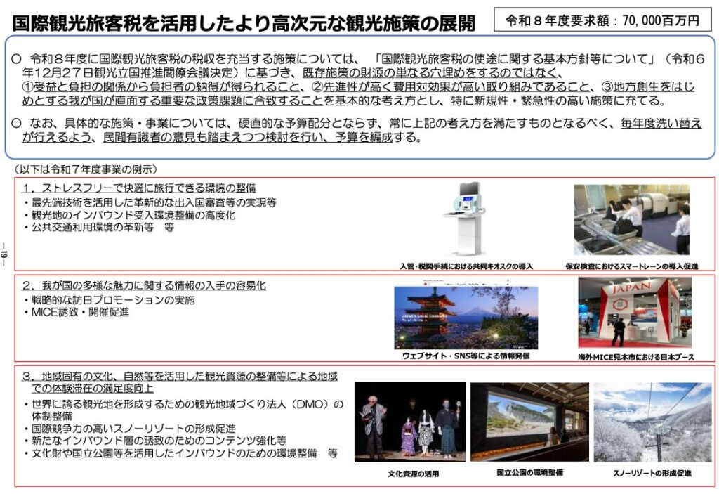 特に新規性と緊急性の高い施策に充当することを掲げ、受益と負担の関係、先進性、費用対効果、地方創生への貢献の観点から、毎年見直しが行われている。令和7年度の事業を例にすると、ストレスフリーで快適な旅行環境の整備、日本の多様な魅力に関する情報入手の容易化。そして地域固有の文化・自然等を活用した観光資源の整備による体験滞在の満足度向上、といった分野に充当された。