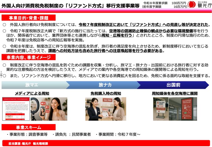 前年度要求額61億6000万円から1.12倍の68億7900万円に増加、なかでも大幅な増加となったのは、外国人向け消費税免税制度の「リファンド方式」移行支援事業等で対前年度比6.25倍の1億円。令和7年度税制改正に伴い免税店等への周知広報を実施したが、2026年度は旅行者の満足度を高めるため、旅マエ・旅ナカ・出国前の効果的な注意喚起を行い、港湾や空港での混乱を防ぐ。また地方の消費拡大を狙い、免税に関する面的な取組を支援する。