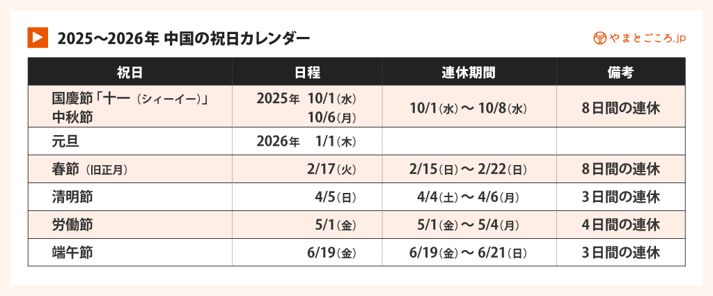 2025年〜2026年・中国の祝日カレンダー