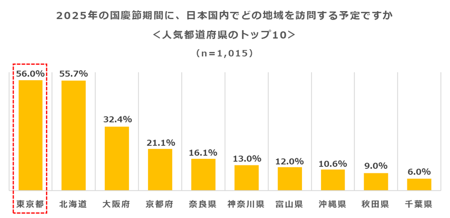 訪問予定の地域としては、東京(56.0%)と北海道(55.7%)がほぼ同率で最多でした。東京ではショッピングやアニメ・漫画文化を中心とした都市観光、北海道では自然景観と海鮮グルメへの期待が理由として挙げられています。また、大阪(32.4%)ではUSJや関西万博(閉幕直前)の影響、京都(21.1%)では歴史や文化体験への関心が高まっています。