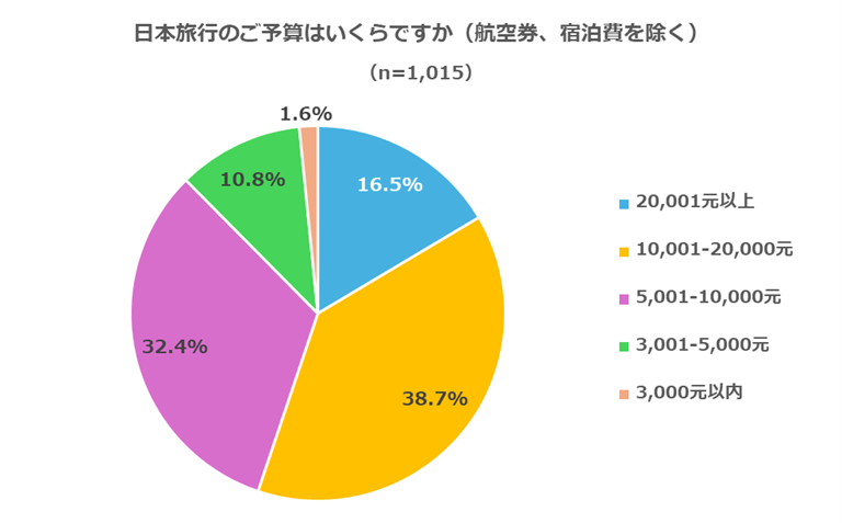 旅行予算については、最も多かったのが10,001〜20,000元(約21万〜42万円)で、38.7%を占めました。一方で、春節期と比較すると20,001元以上の高額層は減少し、5,000元以下の低価格帯がやや増加傾向にあります。これは円安効果の飽和に加え、実用性重視の消費志向が強まっていることを反映しています。