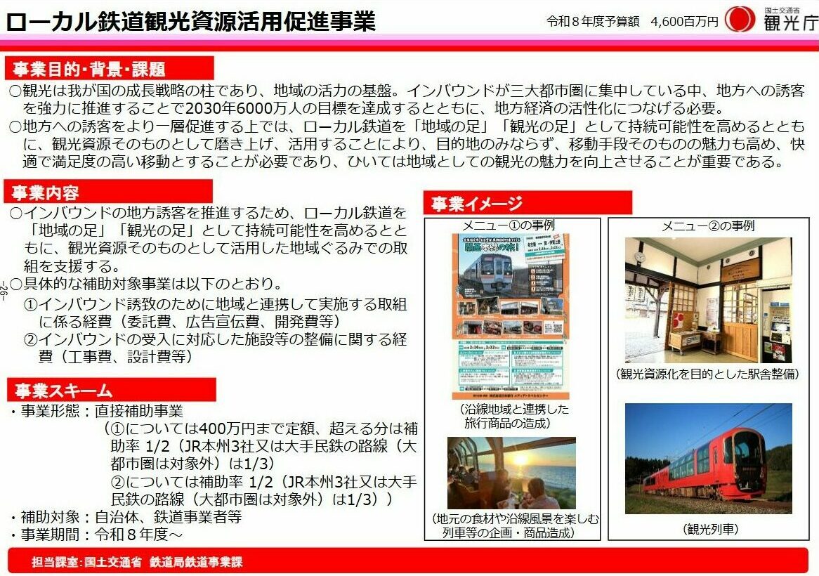 2026年度新たに計上されたローカル鉄道の活用を支援する観光資源活用促進事業(46億円)では、沿線地域との連携による旅行商品の造成や、駅の魅力向上を図る整備を支援対象とする。