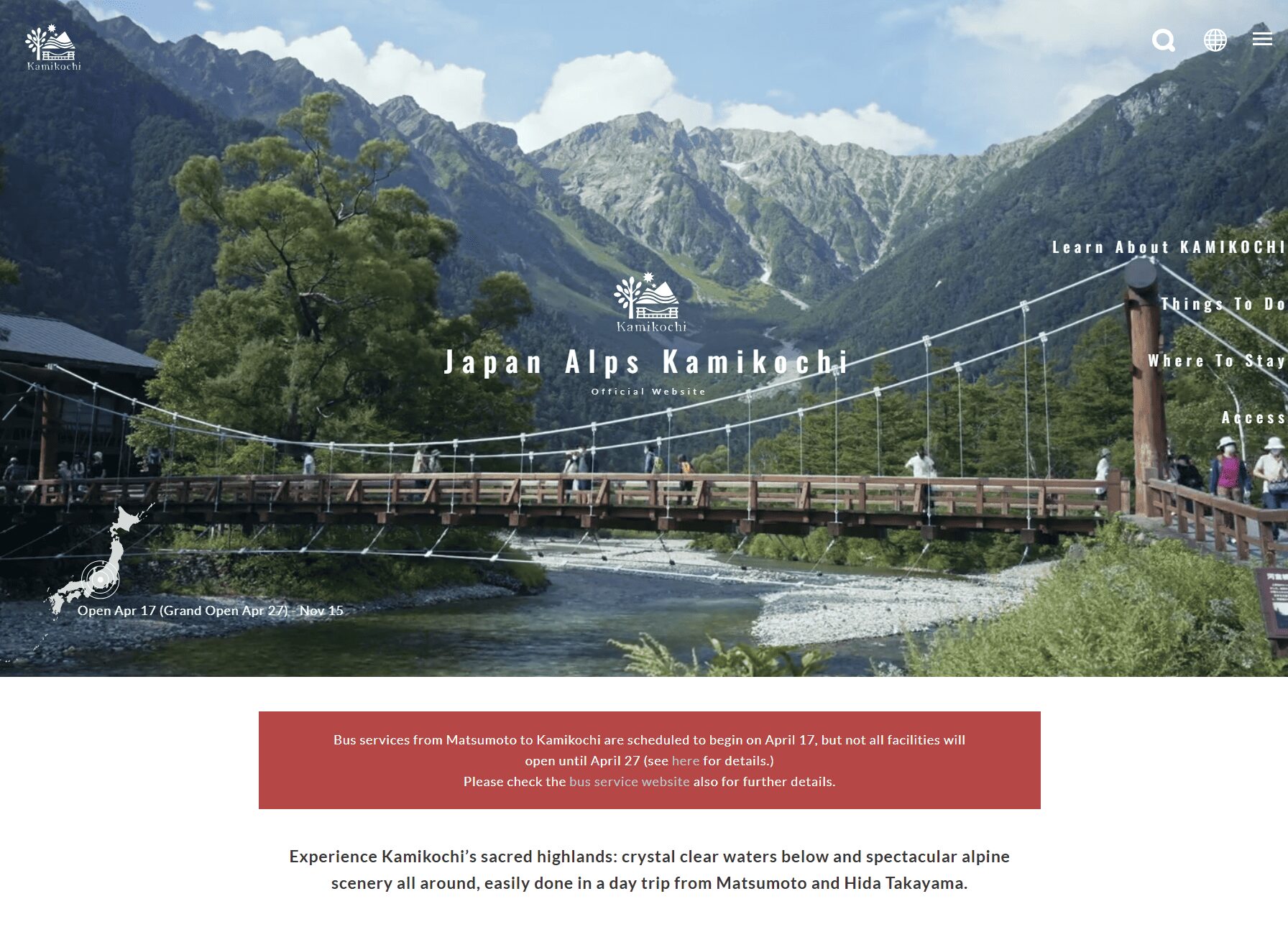 リニューアルにあたってまず着手したのが、トップページの全面的な設計変更だ。日本人には周知されている冬期の閉山という重要な情報が、訪日外国人には十分に届いておらず、「いつ行けるのか」といった問い合わせが、海外から多く寄せられていた。解決策として、多言語版のウェブサイトでは、日本語サイトにはない「日本地図上での上高地の位置」と、外国人から問い合わせの多い「入山可能時期」を、最初に目に入る位置に配置した。アクセスに必要なバスの案内も冒頭にまとめ、閉山中も開山時期がひと目で理解できるように整えた。