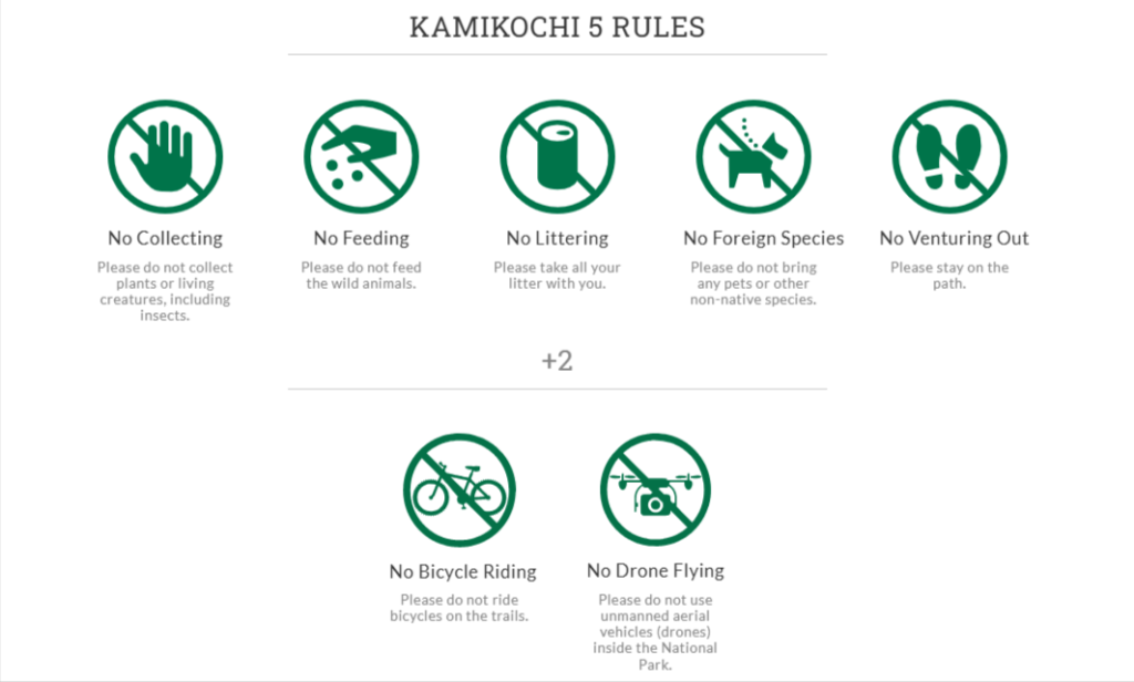 国立公園である上高地では、生態系保護のためのルール遵守は徹底したいところだが、インバウンド客の行動に、国内客から苦情が寄せられることが少なくなかった。「植物や昆虫などの生きものを採らない」「ゴミはすべて持ち帰る」といった上高地5つのルールは、日本語ページにもあるが、多言語ページではトップに近い目立つ場所に配置している。