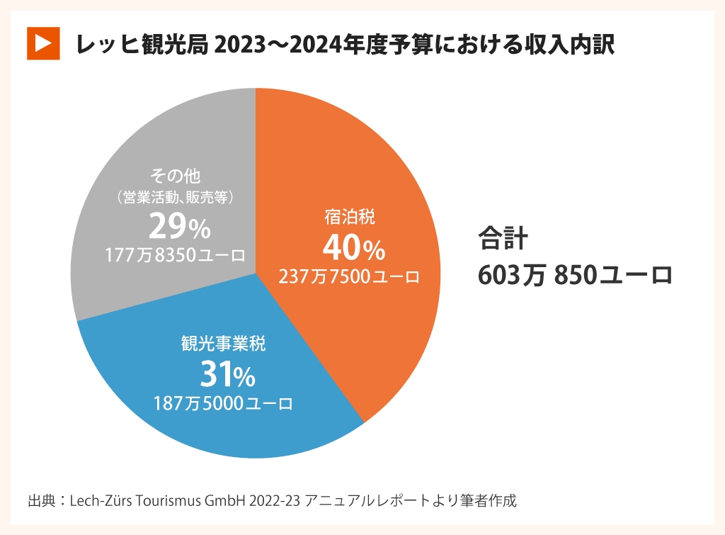レッヒの様々な施策は、宿泊税に加え、観光事業者税やその他の収入も含めた観光局の総合的な予算によって支えられている。その中でも宿泊税は、年間総予算の大きな柱として、地域全体の取り組みの基盤を形成している。