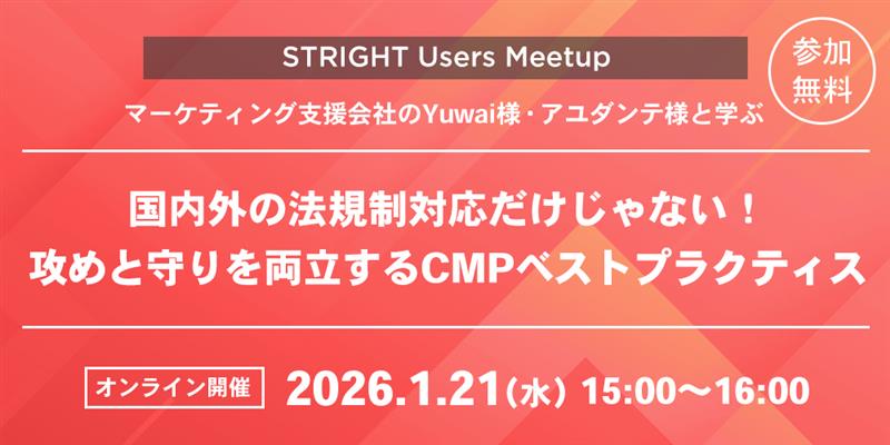 本イベントでは、マーケティング支援会社のYuwai株式会社様とアユダンテ株式会社様をお招きし、国内外の法規制対応や計測を維持しつつ運用負荷を抑えるための実務的な考え方を、CMP(クッキー同意管理ツール)「STRIGHT」の具体的な事例を交えて解説します。