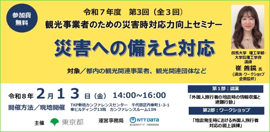 東京都主催|第3回 観光事業者のための災害時対応力向上セミナー「外国人旅行者の地震時の情報収集と避難行動」等