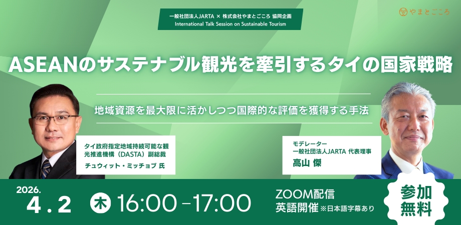 本ライブでは、DASTAが推進する「コミュニティ・ベースド・ツーリズム(CBT)」の成功事例や、スコータイをはじめとする都市をユネスコ創造都市へと導いた戦略、タイ観光の変革プランなど、地域資源を最大限に活かしつつ国際的な評価を獲得する手法について伺います。