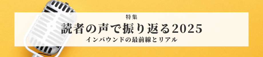 2025年は、インバウンド観光が本格回復する一方で、業界全体が「再構築」のフェーズに入った一年でした。 各地で多様な挑戦や変化が進んだものの、現場のリアルな声はなかなか共有される機会が少なく、実態が見えにくいのも事実です。 本特集では、読者アンケート(定量・自由記述)をもとに、現場の声から1年を振り返る年末特集として、 中小事業者や自治体担当者の経験・課題・発見を集約し、「業界の記録」として可視化します。 2025.12.10 55%が売上増も二極化が進行、数字で語る2025年インバウンド市場総括【定量編】 2025.12.17 回復の裏にある“質”への挑戦、読者アンケートから読み解く2025年インバウンド最前線【定性編】