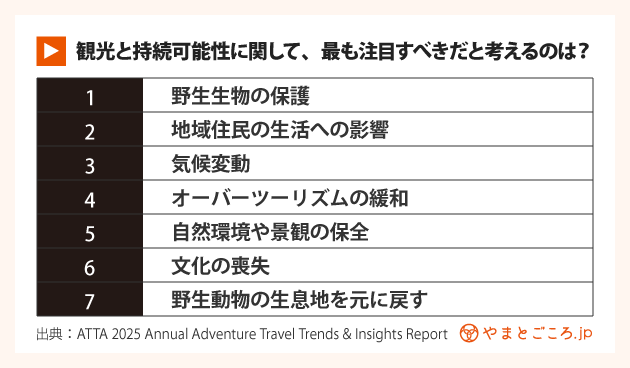 アドベンチャートラベルのツアーオペレーターに、観光および環境保全に関する課題として最も注目に値するものを答えてもらったところ、野生生物の保護、地域住民の生活、気候変動などが挙げられた。