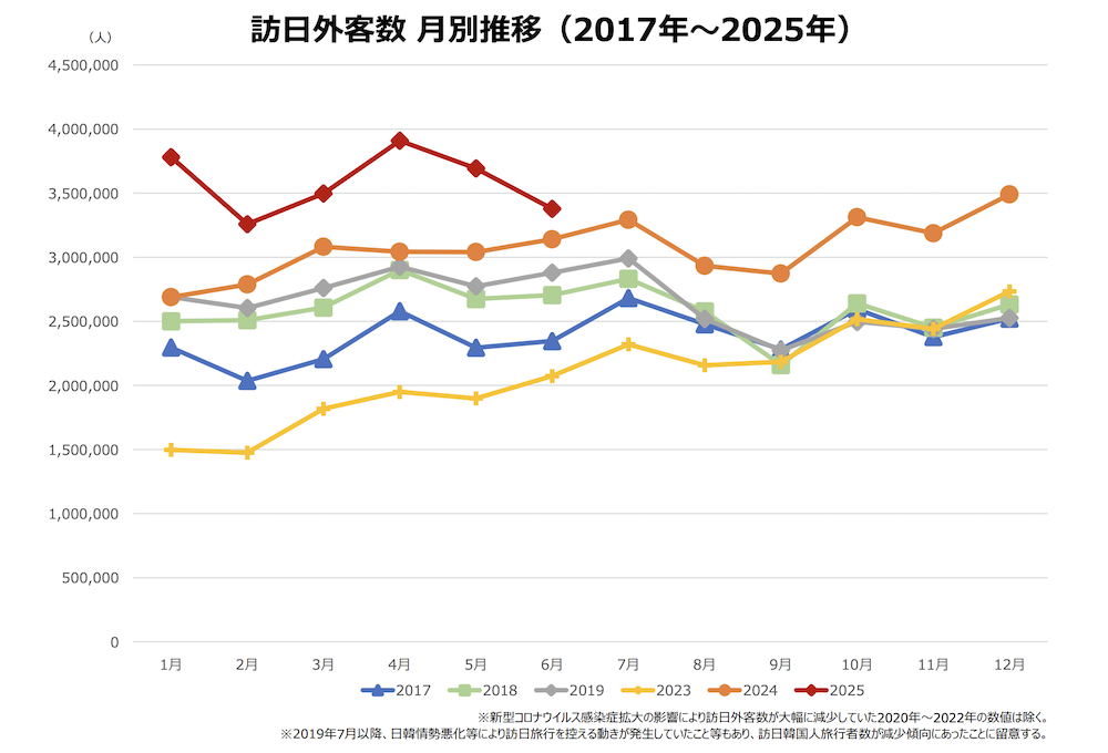 2025年6月の訪日客数337万人、1-6月の累計2151万人。前年同期を370万人超上回る