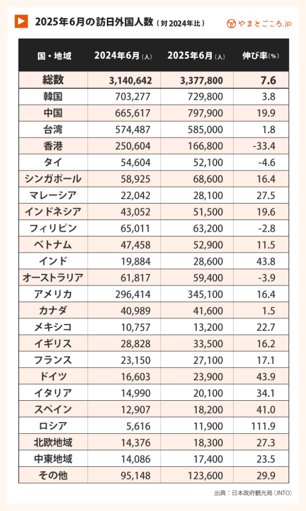 やまとごころ編集部日本政府観光局(JNTO)は2025年6月の訪日外国人数(推計値)を発表。それによると、6月の訪日客数は前年同月比7.6%増の337万7800人となり、6月として過去最高を記録した。1〜6月累計では2151万8100人に達し、過去最速で2000万人を突破。なお、2024年1~6月の1778万2422人から、370万人以上上回っている。