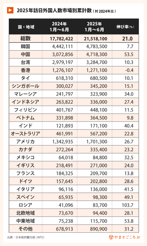 2025年1〜6月の累計訪日客数は2151万800人で、前年同期比21.0%増。市場別では韓国が最多の478万3500人(前年比7.7%増)、中国471万8300人(53.5%増)と続く。