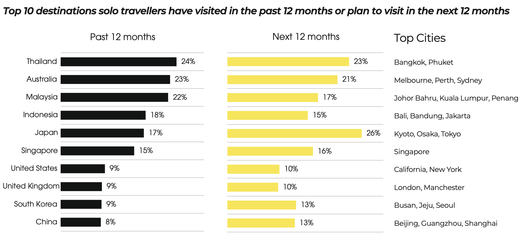 アジア太平洋(APAC)のソロトラベラーの73%は海外旅行を好み、特に近隣の国を訪れる傾向が強い。過去12カ月と今後12カ月の旅行先トップ10のうち、8カ国はAPAC地域が占めている。APAC以外でランクインしているのはアメリカとイギリスのみだ。