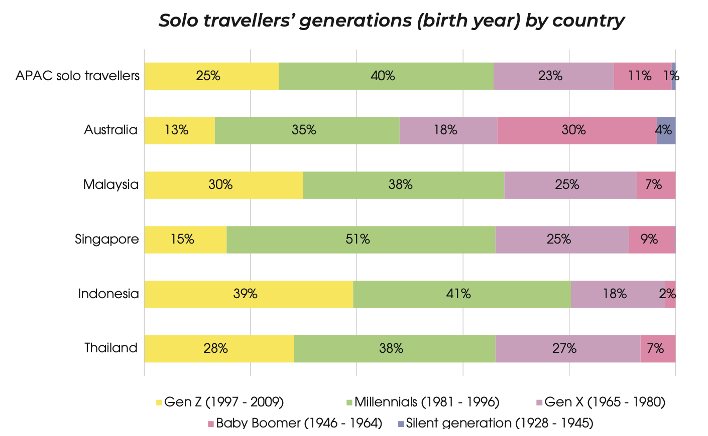 ▶︎国別ソロトラベラーの世代 (上から、APAC平均、オーストラリア、マレーシア、シンガポール、インドネシア、タイ)