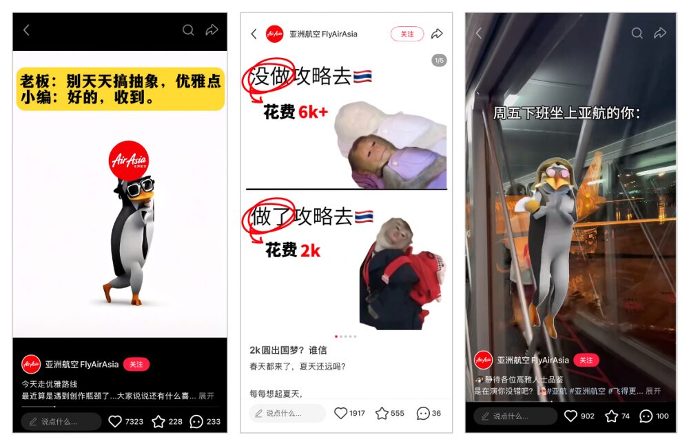 空会社部門では、エアアジアが首位を獲得した。平均エンゲージメント数は前年比194.28%増となり、カテゴリー内で最も高い成長率を記録した。エアアジアでは、疲弊したペンギンのキャラクターなど、中国のネットミーム(インターネットを通じて人が人の真似をして広がっていく文化や行動のこと)を取り入れた「ローエフォート(あえて作り込まない)」投稿を展開し、若年層ユーザーの共感を獲得。1万件を超えるインタラクションを記録する投稿も見られた。2位にはキャセイパシフィック航空、3位にはアシアナ航空が続いた。