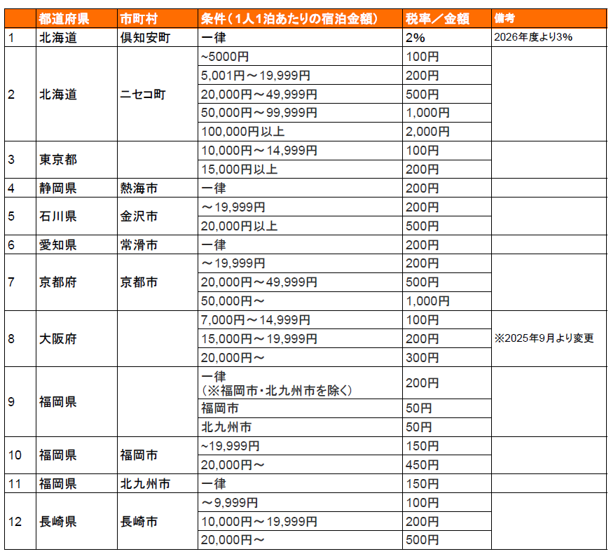 ▶2025年7月時点で宿泊税導入済みの地域の税率/金額