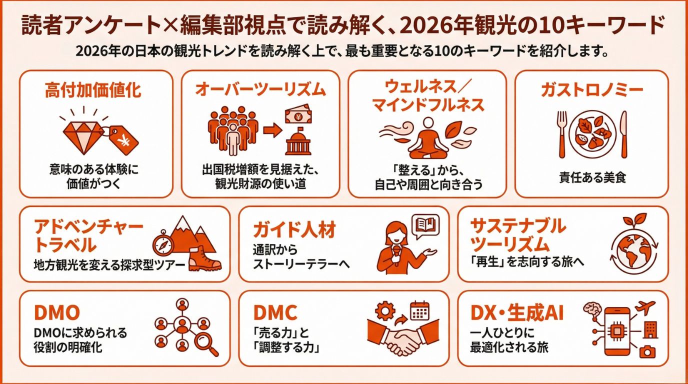 本稿では、2025年に実施した読者アンケート調査の結果に基づき、観光・インバウンドの現場で働く実務者や自治体関係者の関心の高まりを分析した。その内容を手掛かりに、2026年の観光を読み解く10のキーワードを編集部の視点で提示する。